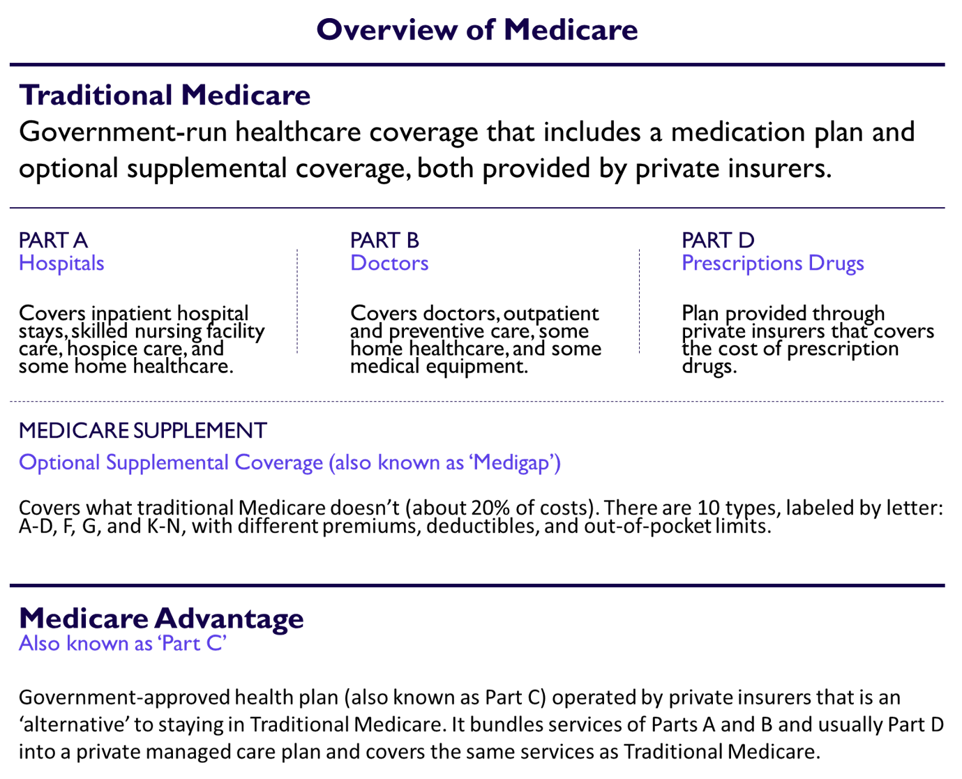 In addition to Original Medicare which is provided directly by the federal government, Medicare also includes Part C (Medicare Advantage), Part D (Prescription Drugs Plans), and Medicare Supplement (Medigap) coverage. These are alternate or supplemental coverage options to Original Medicare that are provided by private health insurance companies: